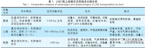 目前我國LNG陸上運(yùn)輸方式包括管道運(yùn)輸、公路運(yùn)輸2種。管道運(yùn)輸是將天然氣液化成LNG液體進(jìn)行長距離管道輸送,為防止液體氣化,需要采用密相輸送工藝,管道內(nèi)實現(xiàn)液體單相流動,管道沿線每隔一定距離需要建設(shè)LNG加壓泵站和冷卻站。除管道運(yùn)輸外,LNG還可以采用公路槽車運(yùn)輸,經(jīng)濟(jì)運(yùn)輸半徑為500~800km以內(nèi),是目前我國LNG主要陸上運(yùn)輸方式。目前只有日本、美國、俄羅斯少數(shù)國家開展LNG鐵路運(yùn)輸業(yè)務(wù),我國還尚未開展LNG鐵路運(yùn)輸業(yè)務(wù)。而鐵路適于長距離、大宗貨物運(yùn)輸,是LNG潛在的陸上運(yùn)輸方式。LNG陸上運(yùn)輸方式優(yōu)缺點比較分析如表1所示。