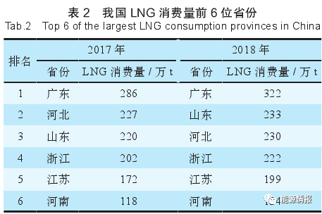 我國天然氣大部分是通過管道直接運(yùn)輸?shù)较M(fèi)區(qū)域,其余以LNG采用公路槽車運(yùn)輸。2018年,我國LNG市場消費(fèi)量為2498萬t,與2017年同比增長25%,LNG消費(fèi)前6名省份年消費(fèi)量均超過100萬t。我國LNG消費(fèi)量前6位省份如表2所示。