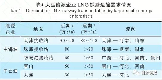 根據(jù)中國海洋石油集團(tuán)有限公司、中國石油天然氣有限公司等LNG鐵路運(yùn)輸需求較多的大型能源企業(yè)調(diào)研結(jié)果,能源企業(yè)具有較大的LNG鐵路運(yùn)輸需求,LNG鐵路運(yùn)輸主要是將LNG從沿海LNG接收站運(yùn)輸至華北、華中和西南地區(qū),LNG鐵路運(yùn)輸流向與LNG運(yùn)輸流向一致。能源企業(yè)迫切希望盡早實現(xiàn)LNG鐵路運(yùn)輸,打通LNG公海鐵多式聯(lián)運(yùn)。大型能源企業(yè)LNG鐵路運(yùn)輸需求情況如表4所示。