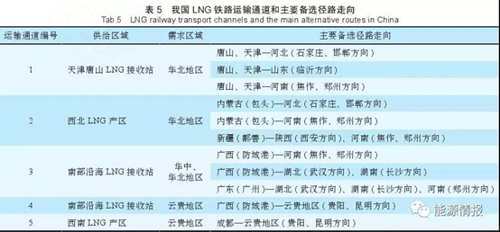 由表5、圖2可以看出,LNG鐵路運(yùn)輸通道和主要備選徑路,發(fā)送端為LNG供給區(qū)域(沿海進(jìn)口LNG接收站和西北LNG產(chǎn)區(qū)),到達(dá)端為LNG需求區(qū)域,備選徑路走向與LNG運(yùn)輸流向一致,基本覆蓋了調(diào)研的各鐵路局集團(tuán)公司管內(nèi)和大型能源企業(yè)的LNG運(yùn)輸需求。第1條運(yùn)輸通道,可以將唐山和天津進(jìn)口LNG運(yùn)輸至華北地區(qū);第2條運(yùn)輸通道可以將西北地區(qū)國產(chǎn)LNG運(yùn)輸至華北地區(qū);第3條運(yùn)輸通道可以將南部沿海進(jìn)口LNG運(yùn)輸至華中、華北地區(qū);第4條運(yùn)輸通道可以將南部沿海LNG接收站進(jìn)口LNG運(yùn)輸至云貴地區(qū);第5條運(yùn)輸通道可以將四川產(chǎn)氣區(qū)域的LNG運(yùn)輸至云貴地區(qū)。我國LNG運(yùn)輸通道和主要備選徑路可以為LNG鐵路運(yùn)輸徑路規(guī)劃提供參考。